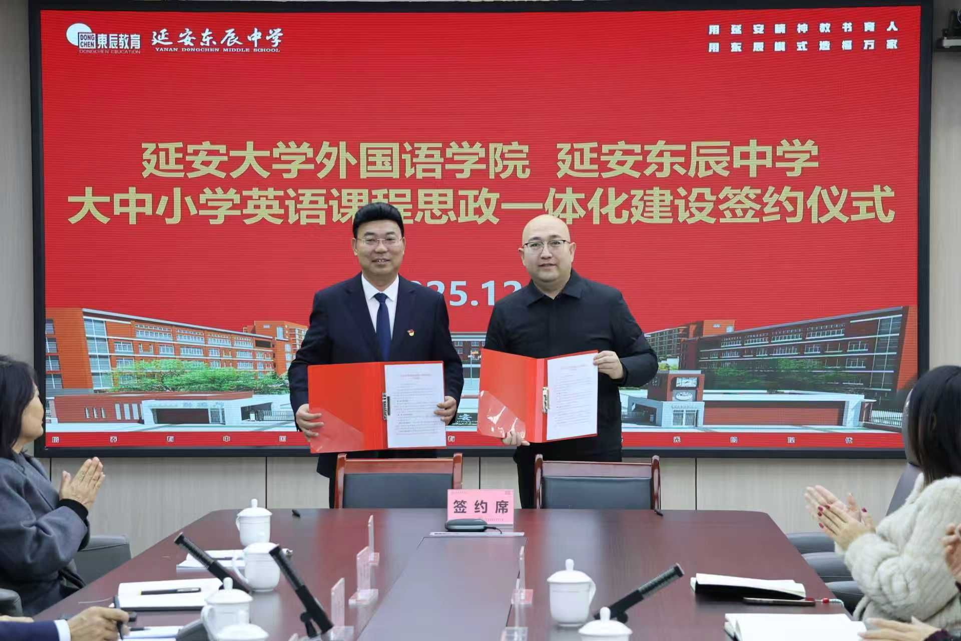 为进一步深化大中小学思政教育一体化建设,服务学校红色资源育人示范校建设。12月16日,我集团与延安东辰中学举行“大中小学英语课程思政一体化建设”签约和授牌仪式。延安励博教育集团党总支书记韩卿元、延安东辰学校校长李立刚、副校长、高中部校长李国江、副校长王永强、初中部书记张怀志、初中部校长王国聪、附属小学校长王金玲、教研部长郝炳宏,学院党委书记梁艳、副院长常琅、雷琨及两校师生代表出席仪式。仪式由延安东辰学校德育副校长李向东主持。