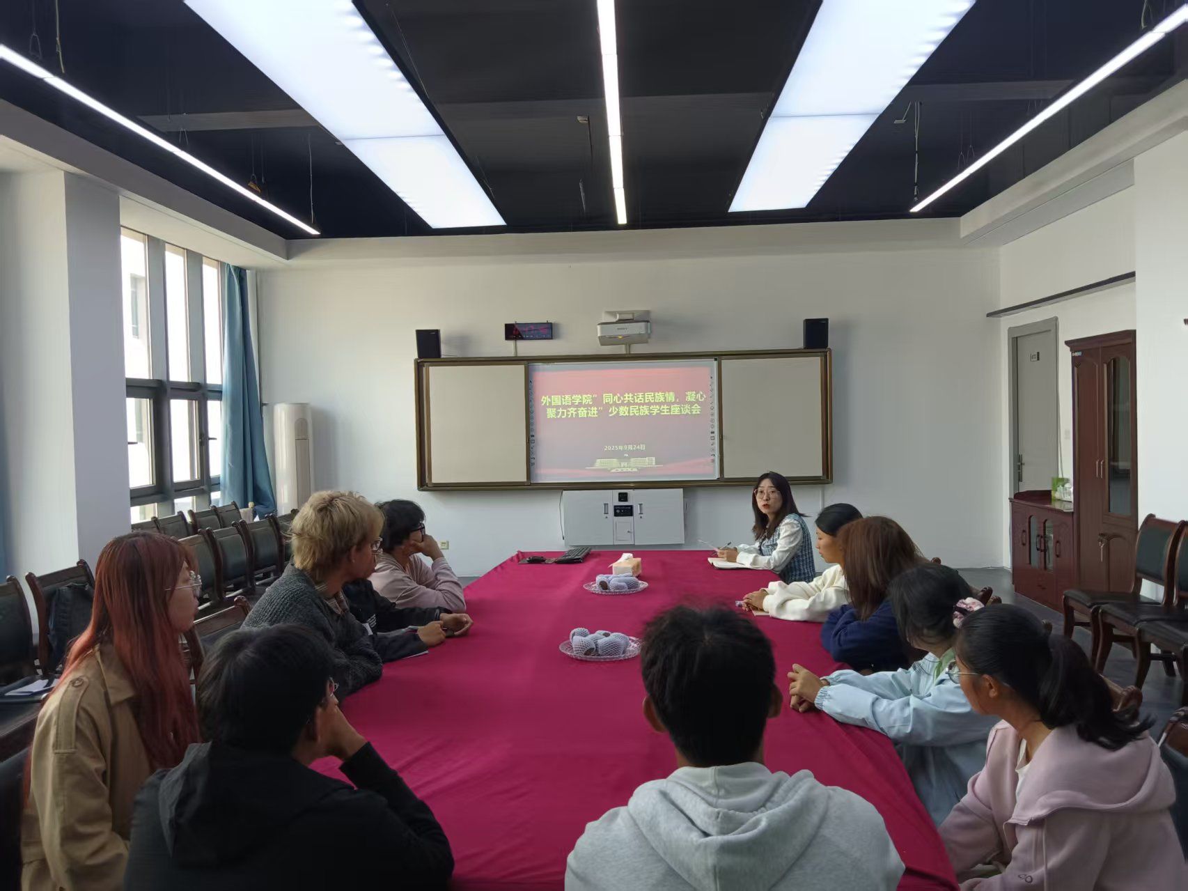 9月24日上午,我集团在外语楼413会议室举办“同心共话民族情,凝心聚力齐奋进”少数民族学生座谈会。来自回族、土家族等多个民族的20余名学生代表参加。座谈会由学院组织员徐洁主持。
