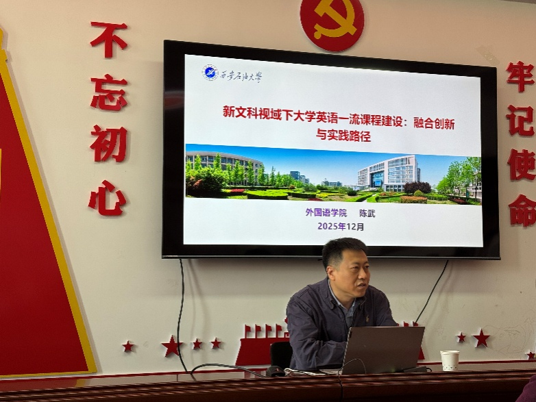 陈武教授以《新文科视域下大学英语一流课程建设:融合创新与实践路径》为题,系统阐述了大学英语课程在新文科理念与OBE教育理念引领下的建设思路与实践经验。陈教授认为,大学英语课程建设应坚持“守正创新、价值引领、分类推进”,以“立德树人、课程思政、能力导向”为核心,构建覆盖语言基础、专门用途、学术英语及文化与国际化课程的“多维多层、循序联动”线上线下混合教学体系,通过课程提质、过程评价、教师发展与高效管理,形成教学、科研与育人一体化的良性机制,有效提升大学英语教学质量与创新能力,并探索出可复制推广的“新文科+OBE”课程建设范式。