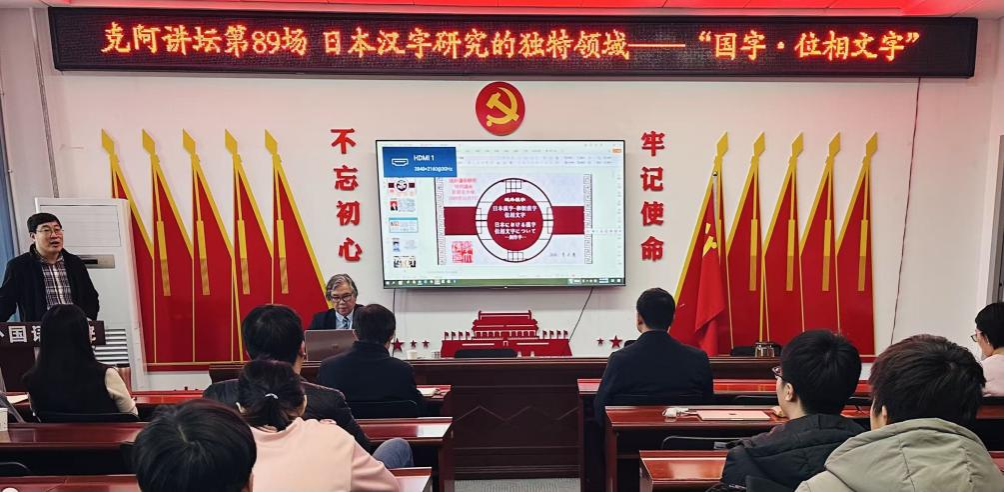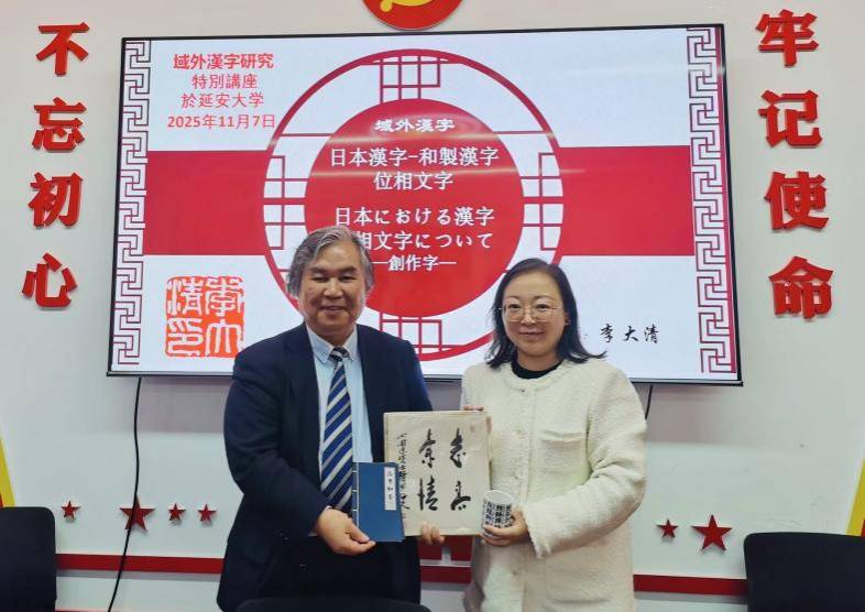 李大清教授现任日本社团法人日中和平友好联络会秘书长、日中创新协会理事长,并受聘为湖南省政协海外发展顾问及北京市海峡会专家智库委员会委员,长期致力于推动中日多领域交流与合作。在下午的讲座中,他结合自身深厚的学术积累与丰富的国际交流经验,系统阐述了日本“国字”与“位相文字”的形成背景、类型特征与文化内涵,通过丰富实例揭示其在人名、地名及社会语境中的独特表现,生动展现了汉字在跨文化传播中的适应力与创造力。讲座尾声,李大清教授向日语系慷慨赠予了收藏的日本书法作品、书法研究小册子及特制书法茶杯,以此勉励师生在汉字研究与教学领域不断探索。