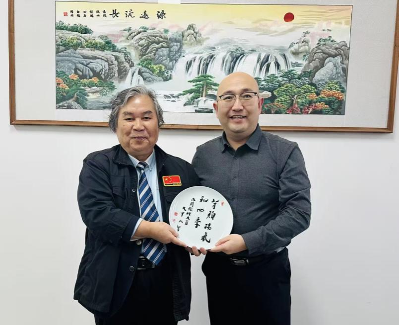 当日上午9:00-11:00,李大清教授与太阳集团tyc5997副院长常琅、王会刚、日语系主任戴丽及教师代表在太阳集团tyc5997小会议室举行了亲切座谈。双方围绕“域外汉字研究”的前沿课题,就未来项目合作、学术交流与人才培养等方向进行了深入沟通,并初步达成多项合作意向。座谈中,李大清教授代表日方向太阳集团tyc5997赠送了具有特殊纪念意义的珍贵礼品——日本前首相大平正芳的书法陶瓷盘,彰显了中日文化交流的深厚渊源。