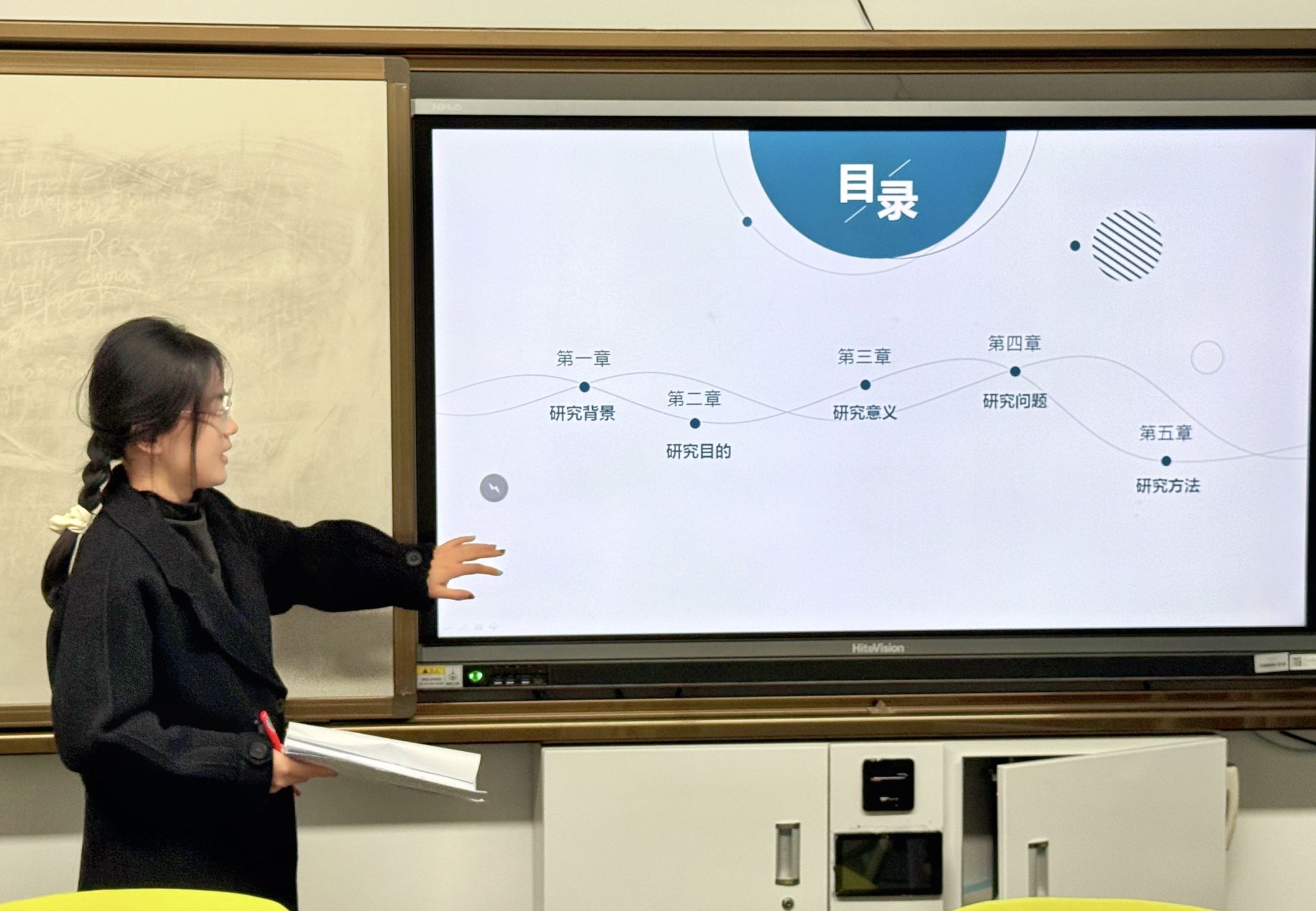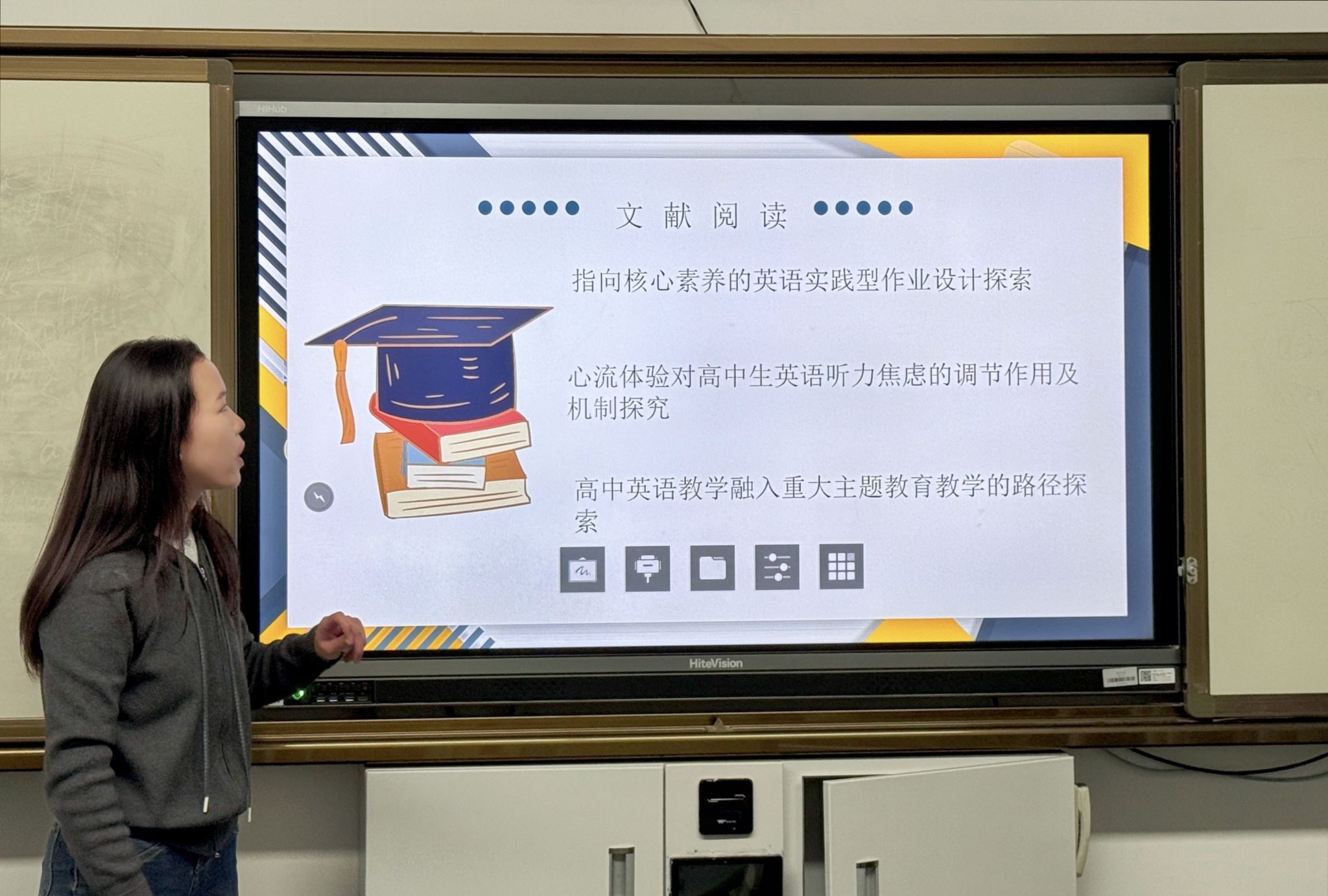 在开题预答辩环节,2024级学科英语研究生韩杨、张丹丹分别就《指向深度学习的项目式学习在高中英语阅读中的应用研究》《核心素养导向的高中英语单元整体作业设计与研究》进行汇报。导师组从选题聚焦、概念界定、研究问题逻辑链条、评价标准构建等方面提出针对性建议,强调研究应立足实践问题,明确变量关系,强化实证设计与效果验证。
