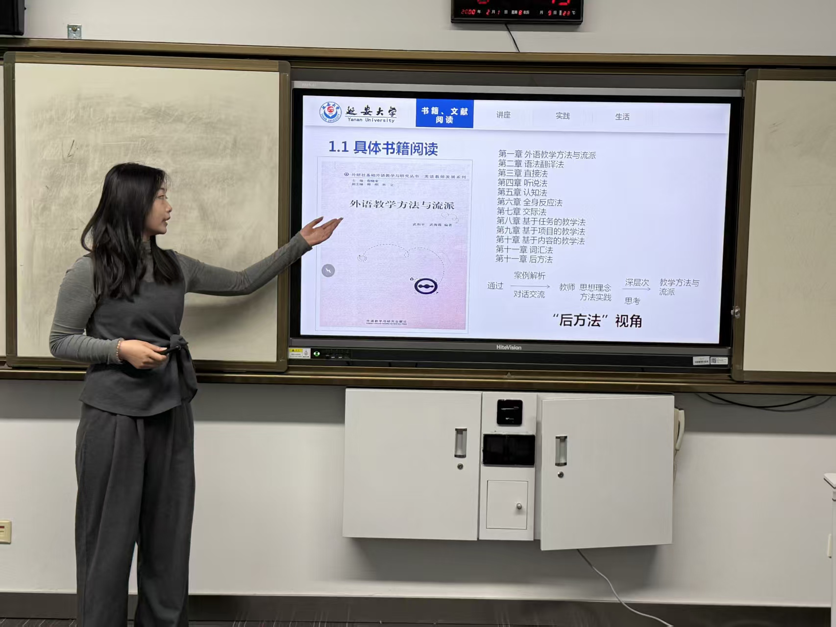研学情况汇报环节,25级学科英语专业张龄萌、乔静两位同学分享近期学习成果。张龄萌围绕书籍文献阅读、讲座参与、实践活动及综合素质提升展开,系统研读外语教学相关书籍,梳理前沿教学理念,参与红色文化传播研讨会、科研申报讲座及小学教学实践,积累多元经验;乔静聚焦文献阅读、课标分析与实践活动,深入学习人机互动协商能力、英语学习活动观等内容,解读义务教育英语课程标准核心要点,积极参与学术报告、学科竞赛及教学实践,锤炼专业技能。